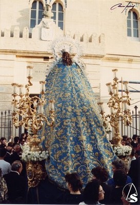 DATOS DE INTERÉS: A la imagen se le colocan suaves cascadas de tirabuzones sobre las sienes, constante tradicióńn que nunca se ha alterado, por cuyo motivo la Señora es conocida por la Inmaculada de los tirabuzones.