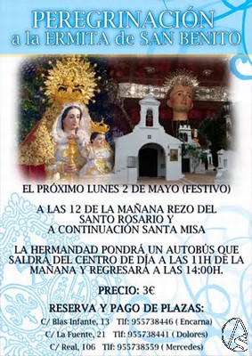 Hdad. del Rosario. El próximo lunes, 2 de mayo, la Antigua, Devota y Fervorosa Hermandad de Nuestra Señora del Rosario Coronada, Patrona y Alcaldesa Perpetua de la Villa de Burguillos (Sevilla) organiza una peregrinación a la ermita de San Benito de Castilblanco de los Arroyos, para lo cual se dispondrá de un autobús que saldrá del Centro de Día a las 11:00 de la mañana y regresará a las 2:00 de la tarde, con un precio de 3,00 € por plaza.