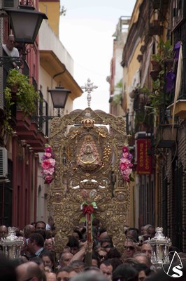 J.Corchero. El Milagroso Simpecado de Nuestra Señora del Rocio de Sevilla (Triana) regresó ayer a su Capilla de la calle Evangelistas arropado por un gran número de fieles, hermanos y devotos.