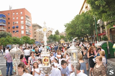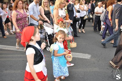 En el cortejo se pudo ver a un nutrido grupo de pastorcitas que repartían chuches y estampas a los niños, así como niños y niñas de comunión que abrían el cortejo.