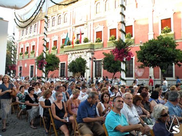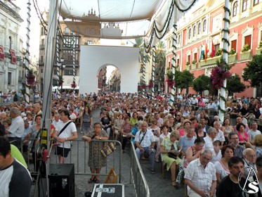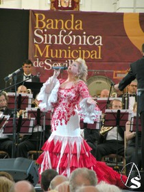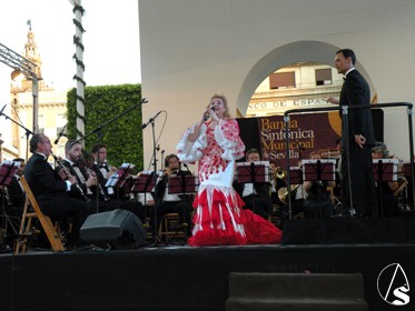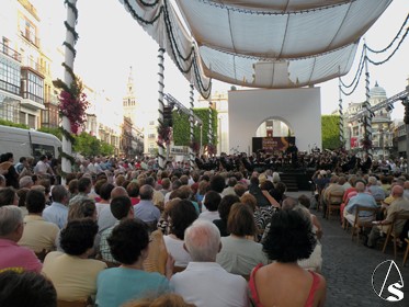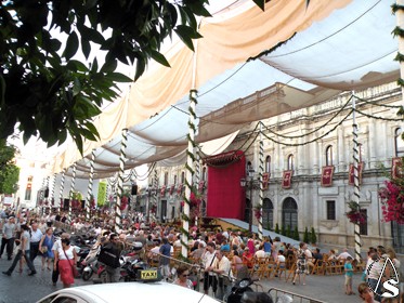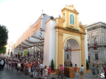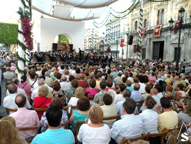 Arte Sacro. Ya llega otro año más de las grandes fiestas de Sevilla, la del Corpus Christi, pero antes tocara el miércoles 22 de junio, día de la víspera, en el cual durante la tarde y noche, el centro y más concretamente el recorrido que ya lucio de manera extraordinaria, gracia a los distintos altares y balcones, y con el ambiente festivo, con concierto extraordinario de la Banda Municipal de Sevilla que dirige el director Francisco Javier Gutiérrez Juan, bajo el Pórtico de la Plaza de San Francisco (copia de la portada de la iglesia de los Humeros), que sonaron en el concierto la zarzuela de la Boda de Luis Alonso (Gerónimo Giménez), o el pasodoble “Elegía de Manolete, etc.., también participó la cantante de la copla Andaluza Patricia Vela, o también el narrador Cristóbal Cervantes, y por la noche el traslado de la Virgen de la Hiniesta Coronada, patrona del Ayuntamiento hispalense, al altar que preside cada año en la fachada del consistorio sevillano.