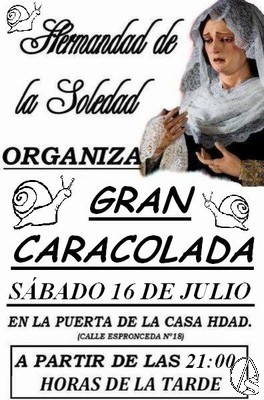 Arte Sacro. La Hermandad y Santa Cofradía de Nazarenos del Santo Entierro de Cristo y María Santísima de la Soledad, fundada el 22 de junio de 1590 en la villa de Aznalcóllar (Sevilla) organiza para el próximo sábado 16 de julio a partir de las 21 horas su II Gran Caracolada a beneficio de la Hermandad.Aparte de caracoles, se podrán degustar una amplia variedad de tapas y todo a precios populares.