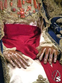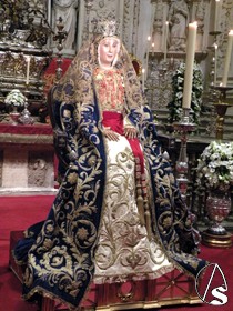 La Virgen de los Reyes lucirá en su salida anual del próximo 15 de agosto (lunes festividad de la Asunción), el manto de color rojo, con cuidada guardilla y salpicado de flores de sabor barroco, obra del Siglo XIX, que donase la infanta Luisa de Borbón, es uno de los cinco mantos que alterna la imagen de la patrona en su salida procesionales, la ultima vez que lucio el manto rojo en su procesión agosteña, fue en el año 2006. La Virgen es una obra gótica, esculpida hacia la primera mitad del siglo XIII, deriva posiblemente de modelos franceses de su época, la talla mide 1,76 metros, el rostro apenas se muestra esbozado, los rasgos de la nariz son de poco relieve, los labios ligeramente marcados, con candorosa sonrisa y los ojos pintados, las manos son largas y elegantes, 21 centímetros, muy simple de modelado y en forma medieval de peine.