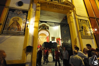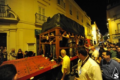 Los costaleros, al mando de Pepe Monge y Luis Miguel Fajardo, sacaron el paso de la capilla para subirlo a un camión con una rampa movible que se encontraba en la misma calle Orfila. Este camión, marcha atrás, conectó con el trailer donde se introdujo la parihuela, todo ello con los costaleros con el paso levantado y llevando el paso con unos movimientos lo más reposado posible, ante el cimbreo del trailer.
