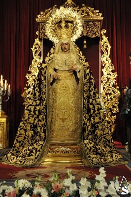Pirámide de luz, acantilado dulcemente pedregoso, en el que un mar de flores se detiene, no dejando que las olas de la ingratitud te salpiquen ni siquiera el borde de tu manto. Cordillera altísima, cima y collado; torre que se eleva ante nosotros y nos invita a mirar a lo alto, a mirar a través de ella la grandeza del Creador. Así nosotros te vimos y te vemos, y te seguiremos mirando mientras el cordón rojo y blanco de nuestra medalla nos una con la efigie que vemos reflejado en el metal que, de tan diversas maneras, nos sirve de escapulario. Tu Amargura nos impulsa, y nos hace olvidar las tristezas de esta tierra que muchas veces sentimos que no nos pertenece hasta que no atravesamos el atrio y por la ojiva entramos para visitarte en tu casa.