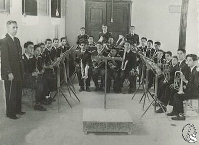 Foto: Despedida de Alberto Escámez de sus alumnos de Adra en el local de ensayo. Archivo de Enrique León Serrano