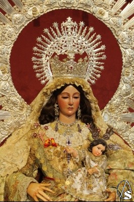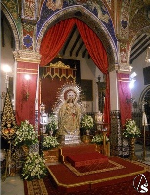 El montaje instalado por la Priostia para este culto fue especialmente llamativo. La imagen de nuestra Titular apareció en posición erguida –al igual que hace dos años– con el Divino Infante en su brazo izquierdo y con la principal novedad de portar la ráfaga procesional del siglo XVII. Para la ocasión fue ataviada con la saya verde bordada de Patrocinio López de mediadios XIX y con un manto brocado verde, además la imagen aparecía bellamente enjoyada para la ocasión y sobre su cabeza la imagen portaba la corona dieciochesca de plata de ley.