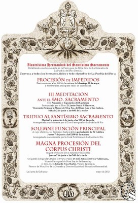 Arte Sacro. El próximo sábado 2 de junio a las 21:00 horas, tendrá lugar la III Meditación ante el Santísimo. Un emotivo acto, preparatorio para el día grande, pronunciado por D. Javier Nadal Villacreces, Vicerrector del Seminario menor de Sevilla. Contará con la colaboración del conjunto de cámara "Fortissimo".