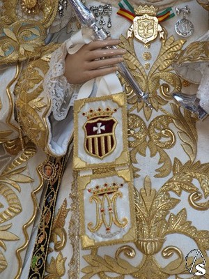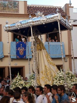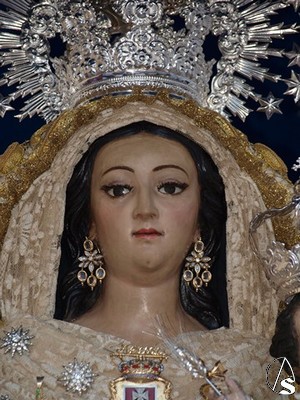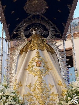 En esta ocasión procesiona bajo templete de plata con seis varales. Luce para esta ocasión saya blanca bordada en oro, al igual que el magnifico manto. Porta corona de plata y cetro en su mano derecha mientras que en la izquierda sostiene al Santísimo Niño que porta una espiga de plata en su mano. Entre las joyas que porta la Virgen destaca la medalla de Oro de la Villa de Mairena del Aljarafe y el escudo mercedario que lleva sobre su pecho.