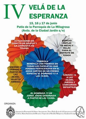 Arte Sacro. La agrupación parroquial de la Milagrosa, con la colaboración del Distrito Nervión, organiza durante los días 15 al 17 de junio, la IV Velá de la Esperanza. Se realizarán actuaciones musicales diversas (desde el estreno público del nuevo Coro de la agrupación al Conjunto Flamenco Azahar y Romero o a la Chirigota de Triana), se podrán degustar las tapas del selecto ambigú que se instalará al efecto, y se hará una gran sardinada el domingo a las 15 horas.