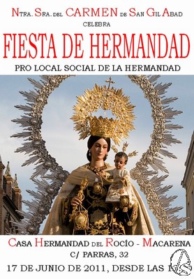 Arte Sacro. Este domingo 17 de junio, la Hermandad del Carmen de San Gil celebra a partir de las 13 horas en la casa de hermandad del Rocío – Macarena, sita en c/ Parras, 32, Fiesta pro local social.