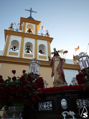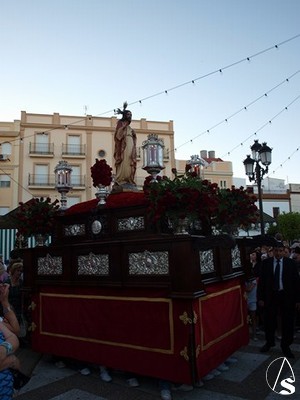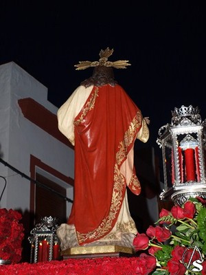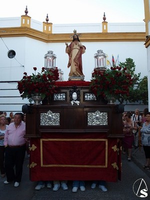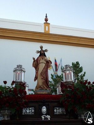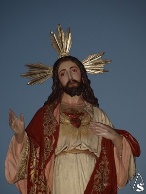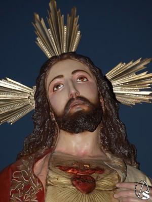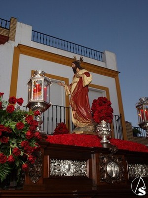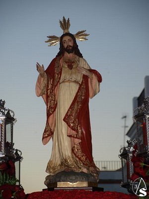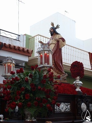 La imagen del Sagrado Corazón de Jesús procesiona sobre paso de madera combinado con cartelas de plata. Alumbran al Señor cuatro faroles de plata con cera roja. El exorno floral estuvo compuesta de rosas y claveles rojos.