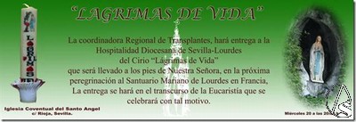 Arte Sacro. Hoy miércoles a las 20 horas y en el transcurso de la eucaristía que se celebrará en la Iglesia Conventual del Santo Ángel en la calle Rioja, se hará entrega a la Hospitalidad por parte de la Coordinadora Regional de Trasplantes de un cirio que llevaran en sua próxima peregrinación el día 29 del corriente a los pies de la Virgen de Lourdes, en su Gruta de Masavielle, como homenaje por aquellos que dieron Vida y por todos aquellos que la pueden dar.