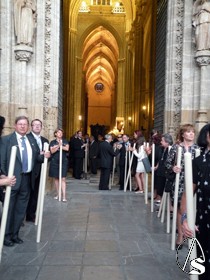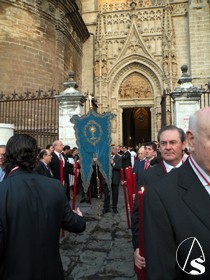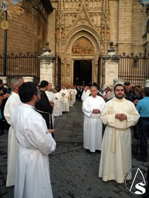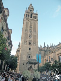A lo largo del recorrido de la procesión, se escucharon en cada esquina, en la conocida como “posas”, los motetes a cargo de los veteranos de la Escolanía “Virgen de los Reyes”, y los repiques de campana de la Giralda, a la salida, en cada esquina y a la entrada.