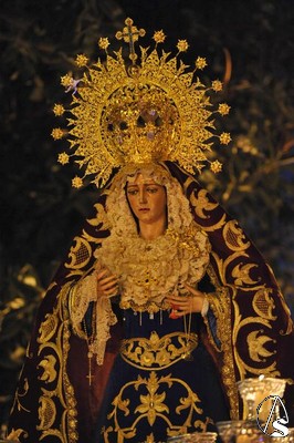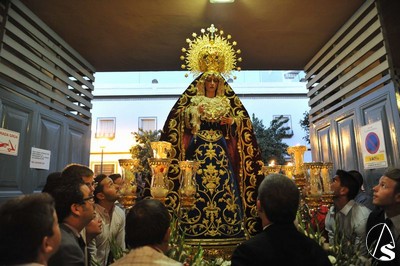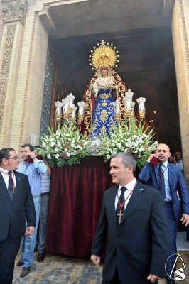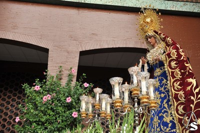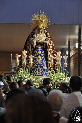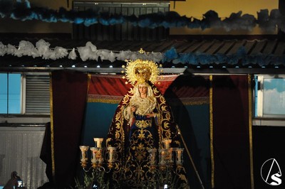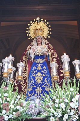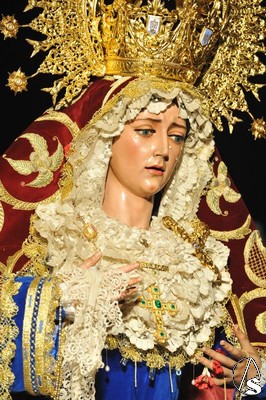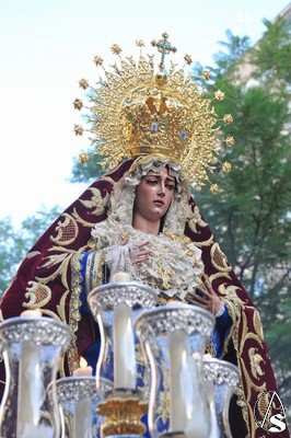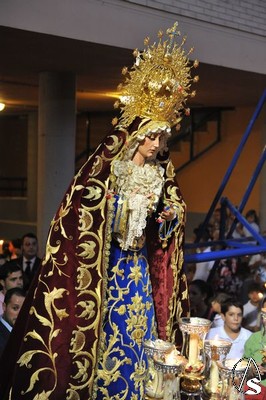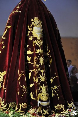 La Virgen lució nuevo manto burdeos realizado en el taller de la Hermandad y saya azul realizado anteriormente por este mismo taller.