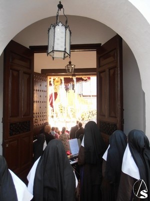 Salida de las gubias de Benito Hita del Castillo la dolorosa de manos entrelazadas que enamoró a todo aquel fiel que tuvo la oportunidad de conocerla en esta procesión salió del templo mudéjar de San Felipe a las cinco y cuarto de la tarde tras una difícil salida en la que los costaleros tienen que ponerse de rodillas debido a las dimensiones de la puerta.
