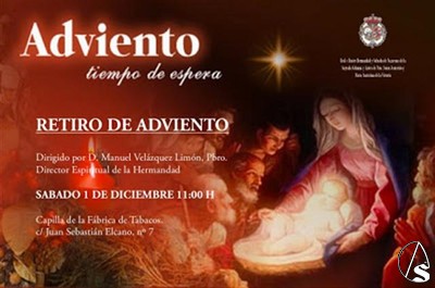 Arte Sacro. El sábado 1 de diciembre de 2012 a las 11 horas en la Capilla de la Fábrica de Tabacos tendrá lugar un retiro espiritual con ocasión del Adviento. El acto será dirigido por el director espiritual de la Hermandad, Manuel Velázquez Limón, y está concebido como un alto en la vida diaria, una parada en el trabajo y en los problemas particulares, para poder reflexionar y pensar grupal e individualmente hacia donde dirigimos nuestras vidas.