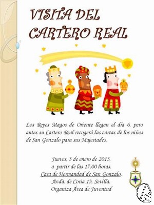 Arte Sacro. La Hermandad de San Gonzalo acogerá en la tarde de hoy, jueves 3 de enero, la visita del Cartero Real de Sus Majestades los Reyes Magos de Oriente a partir de las 17 horas.