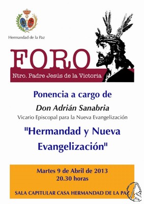 Arte Sacro. Hoy martes día 9 de abril a las 20,30 horas la Hermandad de La paz celebra una charla formativa dentro del Foro Nuestro Padre Jesús de la Victoria a cargo de Adrián Sanabria, Vicario Episcopal para la Nueva Evangelización. El titulo de la ponencia es “Hermandad y Nueva Evangelización.