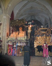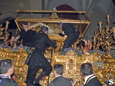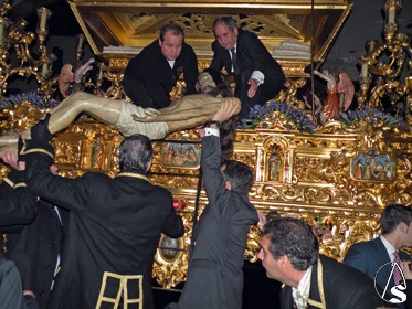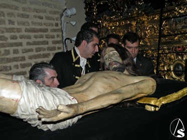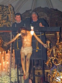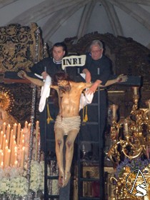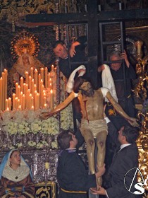 Clavado en una cruz, el Señor de la Misericordia, se representa desde una cruz que se instala en el presbiterio de dicha parroquia, es desclavado y descendido de la cruz por los Santos Varones, simulando a José de Arimatea y Nicodemo y lo presenta a las santas mujeres, las Marías y la mujer Verónica que cada año son representadas por jóvenes soleanas de la localidad, para ser presentados a su Stma. Madre, en presencia de la escuadra de romanos, “armaos “, con uniformes bordado en oro fino y el “SPQR” sobre terciopelo burdeos y posterior traslado al sepulcro. Después se inicia la procesión de regreso hasta su sede canoníca.