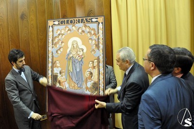 Las advocaciones de la Virgen en las cintas de las guirnaldas de flores, San José Obrero, Sagrado Corazón de Jesús, San Antonio de Padua y Santa Lucía rematando las esquinas y un mensaje de esperanza para este año de la Fe.