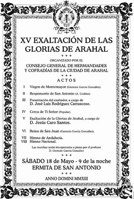 Fran Granado. El Consejo General de Cofradías y Hermandades de Arahal organiza su XV Exaltación de Glorias. El acto se realizará hoy día 18 de mayo en la Ermita de San Antonio a las 21:00 horas.