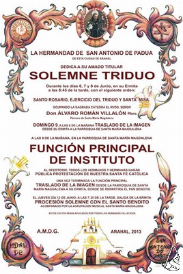 Arte Sacro. La Hermandad de San Antonio de Padua de Arahal realiza entre los días 6, 7 y 8 de junio en su Ermita Solemne Triduo a su amado titular, a las 20:45 horas con el siguiente orden: Santo Rosario, , ejercicio del Triduo y Santa Misa. Ocupando la Sagrada Cátedra el Rvdo. Sr. D. Álvaro Román Villalón, Párroco de Santa María Magdalena.