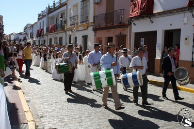 Precedían a la cruz parroquial los tamborileros del pueblo y la seguían los niños y niñas que este año han hecho su primera comunión. Luego formaban las hermandades y asociaciones religiosas del pueblo y por último el grupo de adoración nocturna parroquial. Tras este grupo iba el Santísimo bajo palio y tras ÉL el coro de la hermandad de la Vera-Cruz que participó con numerosos motetes e himnos eucarísticos alternándolos con los cantos tradicionales que entonaron los fieles. Cerraba el cortejo la alcaldesa del pueblo acompañada por la corporación municipal
