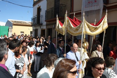 Nuevamente se pudo apreciar el gran respeto, el silencio y la devoción al paso del Santísimo que volvía a bendecir y dar esperanza a los fieles lugareños en tan preciosa mañana de sol aljarafeño.