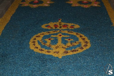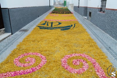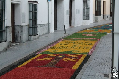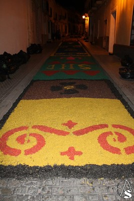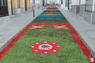Gracias a la colaboración del Excmo. Ayuntamiento y empresas de la localidad que cedieron los materiales, se pudo llevar a cabo tan agotadora como gratificante labor. Se alfombró parte del recorrido, concretamente la calle Cala de Vargas, colindante a la capilla de S. Juan de Letrán y la calle Trinidad, hasta llegar al Hospital de la Santa Caridad, de estrecha vinculación con la Hermandad.