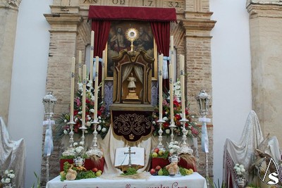 Constaba de un cortinaje rojo recogido con lazadas con los colores de la hermandad, donde se alzaba un cuadro del S. XVIII representando a la Santísima Trinidad, cedido por una familia hermana. Delante de este, un banco alto con el sagrario del altar mayor abierto conteniendo al niño Jesús de la Santísima Virgen vestido de blanco. Sobre este sagrario el Viril que se enmarcaba entre las tres personas de la Trinidad.