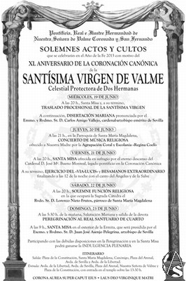 La Pontificia, Real e Ilustre hermandad de Nuestra Señora de Valme Coronada y San Fernando ha presentado el programa de cultos y actos que se celebrarán, en este mes de junio, con motivo del XL Aniversario de la Coronación Canónica de la Virgen y que culminarán el día 23 de junio, fecha de la efeméride, con la peregrinación hasta la Ermita del Cortijo de Cuarto.