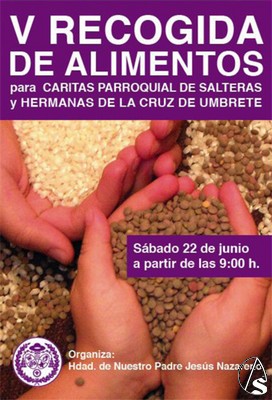 La "V Recogida Benéfica de Alimentos" tendrá lugar hoy sábado 22 de junio desde las 9 de la mañana a las 2 de la tarde por las principales calles de Salteras. Seamos cristianos ejemplares y sigamos la Palabra de Jesús: “El que tenga dos túnicas, comparta con el que no tiene, y el que tiene comida debe hacer lo mismo.” (Lucas 3:10-11)