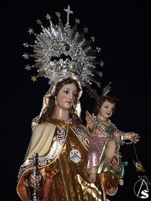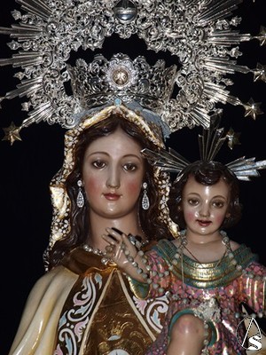 Luce corona de plata, en su mano derecha porta cetro de plata y escapulario, mientras que en su mano izquierda porta al Niño Jesús.