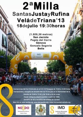Arte Sacro. La Hermandad de la Estrella organiza por segundo año consecutivo junto con el Instituto Municipal de Deportes y el Distrito de Triana, la Carrera de la Milla Santas Justa y Rufina, que tendrá lugar el jueves 18 de julio, comenzando a las 19,30 horas, y recorriendo las calles: San Jacinto, Pagés del Corre, Génova, Gonzalo Segovia y Betis.