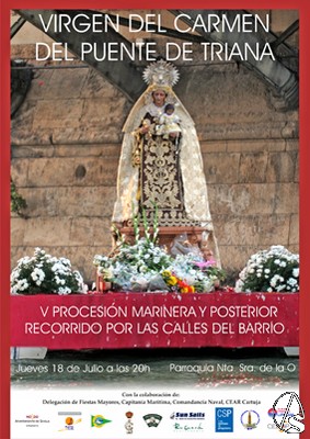 Para la mayor difusión de esta singular procesión fluvial, la hermandad ha editado el V cartel, que llamará poderosamente la atención, teniendo como temática central la Virgen del Carmen en su paseo fluvial debajo del puente de San Telmo construido en 1925 por el Ingeniero francés José Eugenio Ribera Dutaste.
