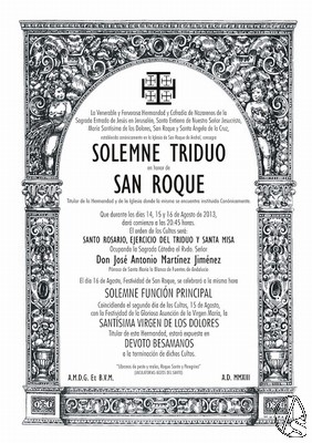 Arte Sacro. La Venerable y Fervorosa Hermandad y Cofradía de Nazarenos de la Sagrada Entrada de Jesús en Jerusalén, Santo Entierro de Nuestro Señor Jesucristo, María Santísima de los Dolores, San Roque y Santa Ángela de la Cruz, establecida canónicamente en la Iglesia de San Roque de Arahal, consagra Solemne Triduo en honor de San Roque, titular de la Hermandad y de la Iglesia se encuentra instituida canónicamente.