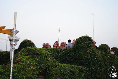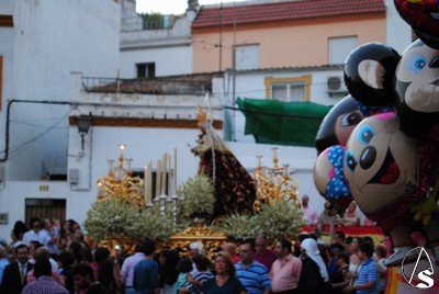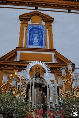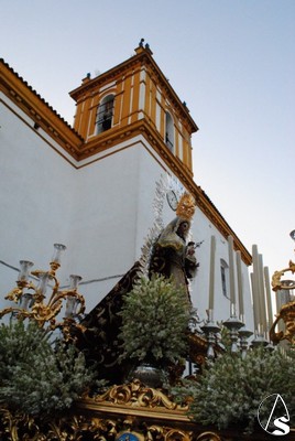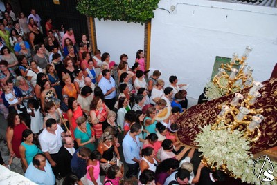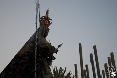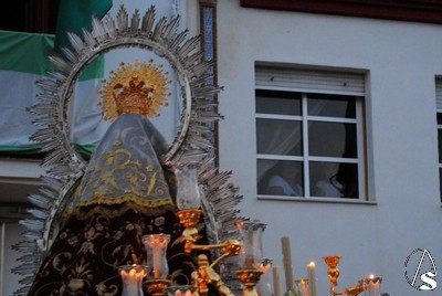 La salida de la Virgen se efectuó a las ocho y media de la tarde, una salida bastante complicada, ya que los costaleros se tienen que poner con las rodillas en tierra para salvar el dintel de la puerta.