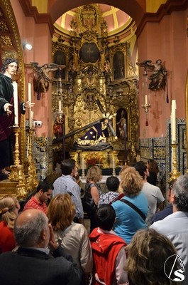 Ya para terminar nos dirigimos a la parroquia de San Vicente donde nos recibió el padre Marcelino, con quién visitamos a Nuestra Señora del Rosario, titular gloriosa de la Hermandad de Las Siete Palabras que se encontraba en la capilla sacramental. En esta capilla se encuentra habitualmente el Nazareno de la Divina Misericordia, de la Hermandad de Las Siete Palabras.