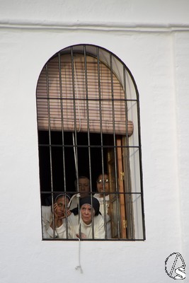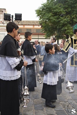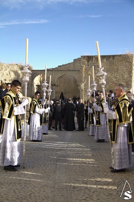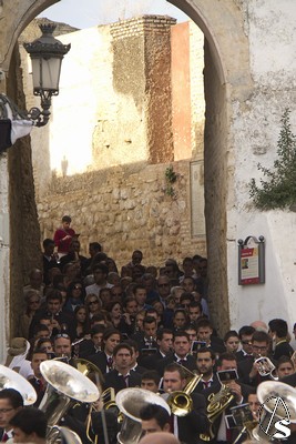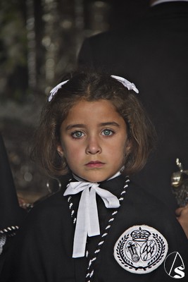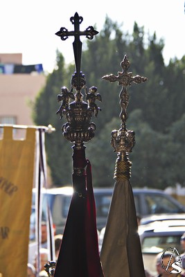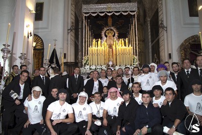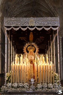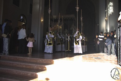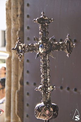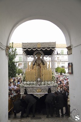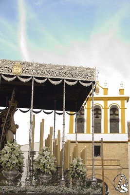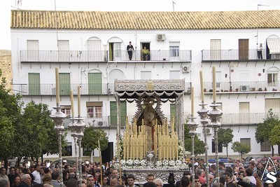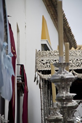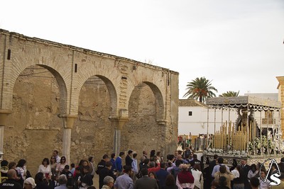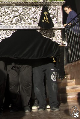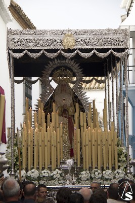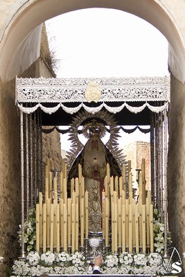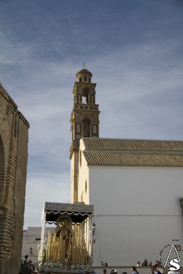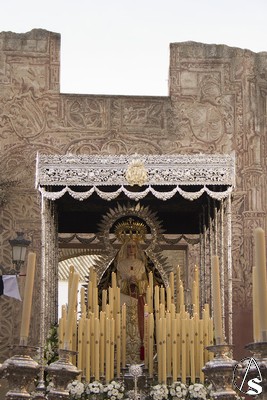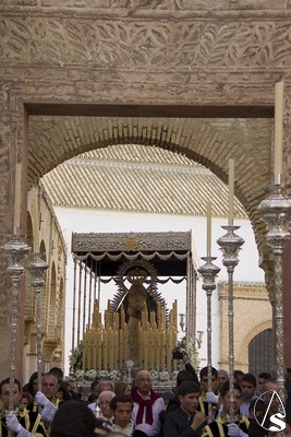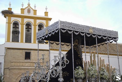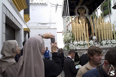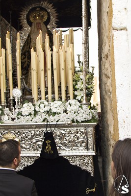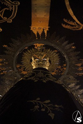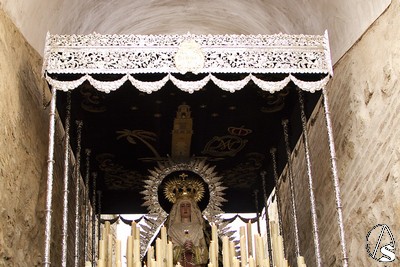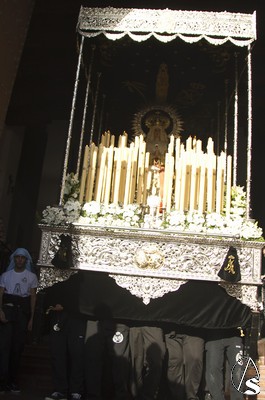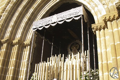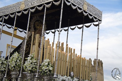 A las 16.00 horas la Hermanad procedió a su Salida Extraordinaria desde su Iglesia. La Virgen en su palio con un manto negro bordado en oro, un techo palio de cajón de estilo marchenero con una inmensa crestería donde colgaban medias lunas, todo fundido en plata a modo de guirnaldas, el techo de palio bordado en su interior con la torre de Santa María, una palmera que nos sorprendió y por lo visto era la que flanqueaba años atrás la Iglesia, las palmera tiene siete hojas y cada una de ellas representa las siente Hermandades de penitencia que tiene esta ciudad. También pudimos observar que lleva bordado el escudo de Hdad en Oro sobre terciopelo negro.