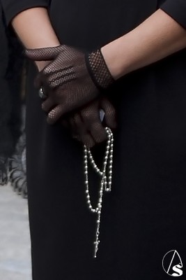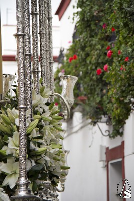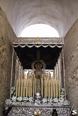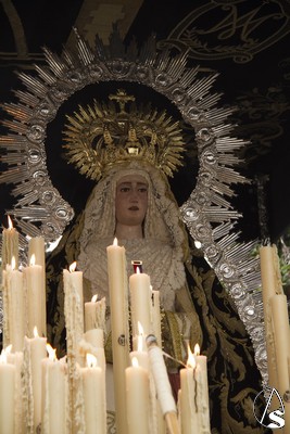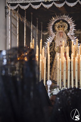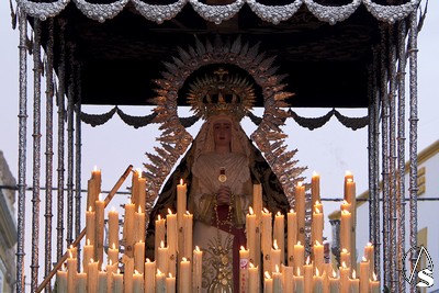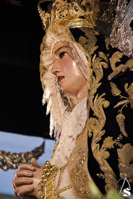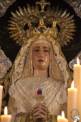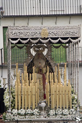 Nos encontramos a la Virgen vestida con una saya inusual, de color blanca bordada en oro, entre sus manos enlazadas un bello rosario de perlas y en su cintura un fajín regalado en su día por el General Galindo. La dolorosa siempre resguardada por su ráfaga plateada peculiar de esta Hermandad de Marchena.