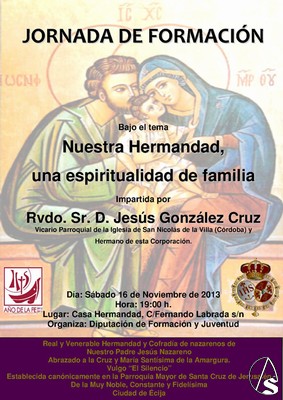 Arte Sacro. La Real y Venerable Hermandad y Cofradías de nazarenos de Nuestro Padre Jesús Nazareno Abrazado a la Cruz y María Santísima de la Amargura. Vulgo “El Silencio”. Establecida canónicamente en la Parroquia Mayor de Santa Cruz de Jerusalén, de la muy noble, constante y fidelísima ciudad de Écija organiza Jornada de Formación bajo el tema “Nuestra Hermandad, una espiritualidad de familia”. Será impartida por Rvdo. Sr. D. Jesús González Cruz Vicario Parroquial de la Iglesia de San Nicolás de la Villa (Córdoba) y hermano de esta corporación.