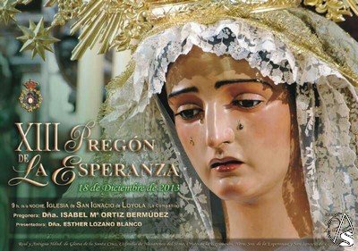 Arte Sacro.  El próximo día 18, día de nuestra Señora de la Esperanza, se celebra el XIII Pregón en Honor a nuestra Titular, que este año tendrá a bien ser pregonado por nuestra Hermana Isabel María Ortiz Bermúdez y presentado por Esther Lozano a las 21:00 horas en la Iglesia San Ignacio de Loyola (La Compañía).