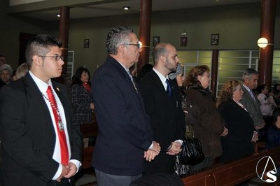 Antes de finalizar la eucaristía, tomo la palabra el Hermano Mayor de la cofradía que reside en la Parroquia (Antonio Castillo Romero), anunciando que tras la santa misa, el músico y Hermano Mayor de la Candelaria Madre de Dios (Moisés Viretti) entregaría a la Hermandad la partitura original de su nueva marcha procesional, Madre de la Divina Gracia, dedicada a la titular dolorosa que procesiona la tarde del Viernes de Dolores.