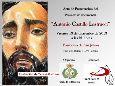 Arte Sacro. Hoy viernes 13 de diciembre a partir de las 21 horas en la Parroquia de San Julián de Sevilla, tendrá lugar la presentación del nuevo proyecto de Cine Club Claudio Guerin. Tras la realización de las películas “La Roldada”, “Juan de Mesa, del olvido al Gran Poder” y “Ruiz Gijón, el Cachorro muere en Triana”, en esta ocasión se aborda la vida y obra del genial imaginero del siglo XX, Antonio Castillo Lastrucci, considerado uno de los padres de la Semana Santa moderna. En el acto participarán el Hno. Mayor de la Hermandad de la Hiniesta y el académico Rogelio Reyes, asesor histórico de la obra.