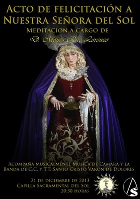 Arte Sacro. El sábado, 21 de diciembre, se llevara a cabo en la Capilla Sacramental del Sol y a partir de las 20,30 horas, la felicitación a Nuestra Señora del Sol. Como ya adelantamos desde el pasado 10 de mayo, será Moisés Ruz Lorenzo el meditador de este tradicional, emotivo e íntimo acto.