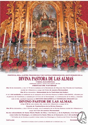 Hdad. Divina Pastora. La Pontificia, Real, Ilustre, Franciscana y Muy AntiguaHermandad del Santo Rosario de la DIVINA PASTORA DE LAS ALMAS Y REDIL EUCARÍSTICO celebrará los siguientes cultos y actos con motivo de las FIESTAS DE NAVIDAD