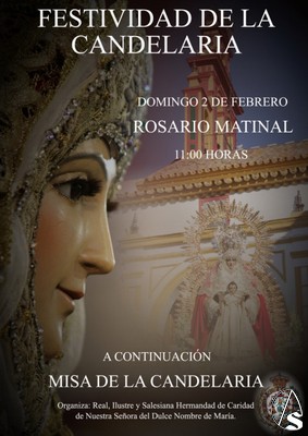 Arte Sacro. Hoy domingo 2 de febrero, Festividad de la Candelaria, la Hermandad de Caridad del Dulce Nombre de María celebrará Rosario Matinal con la imagen de Ntra. Sra. del Dulce Nombre. Éste partirá de la Parroquia de San Sebastián a las 11:00 horas, con el siguiente recorrido: Salida, Cristo del Amor, San Sebastián, Salesiano Antonio Torrero, Mairena, La Plazuela, Gutiérrez de Alba y Entrada.