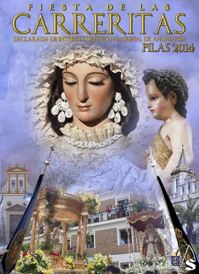 "Este será el cartel oficial encargado de ilustrar la Fiesta de las Carreritas, obra de Juan Valladares Bernal en el que se representa a las dos imágenes titulares de la Hermandad de Belén, la Madre de Dios de Belén y de la Hermandad de la Soledad el Niño de Dios. De fondo podemos ver al Sagrado Corazón de Jesús que es el que vela por la Fiesta de las Carreritas. En el marco inferior vemos el momento de las Carreritas con una foto de Rosario Moreno. Imagen enmarcada por los dos estandartes de sendas Hermandades."
