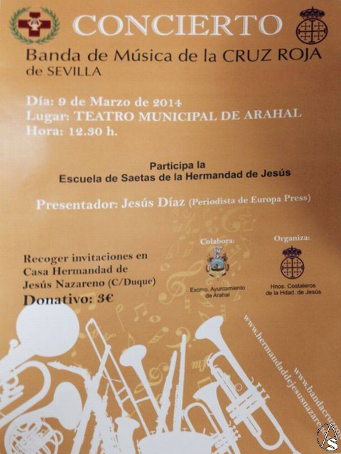 Arte Sacro. La Hermandad de Jesús Nazareno de Arahal organiza el Concierto de música en el Teatro Municipal de Arahal en el que intervendrá la Banda de Música de la Cruz Roja. También participará la Escuela de Saeta de la Hermandad.
